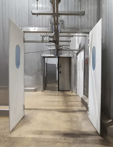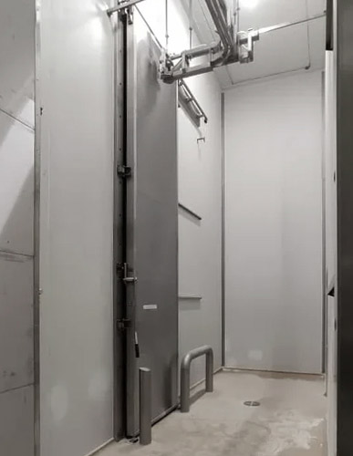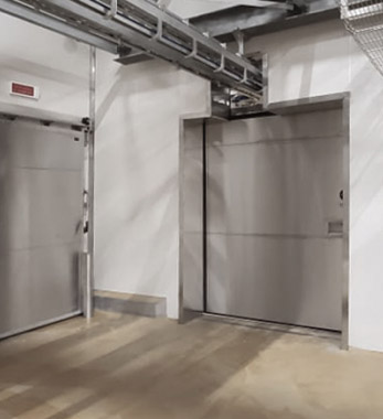 Откатные противопожарные холодильные двери с пределом огнестойкости ОД (EI30) и ОД (EI 60) Полотно двери - оцинкованная окращенная сталь 0,6 мм Рама двери - холоднокатаная сталь 2,0 мм с покрытием порошковой краской Наполнитель – огнеупорная пена |
